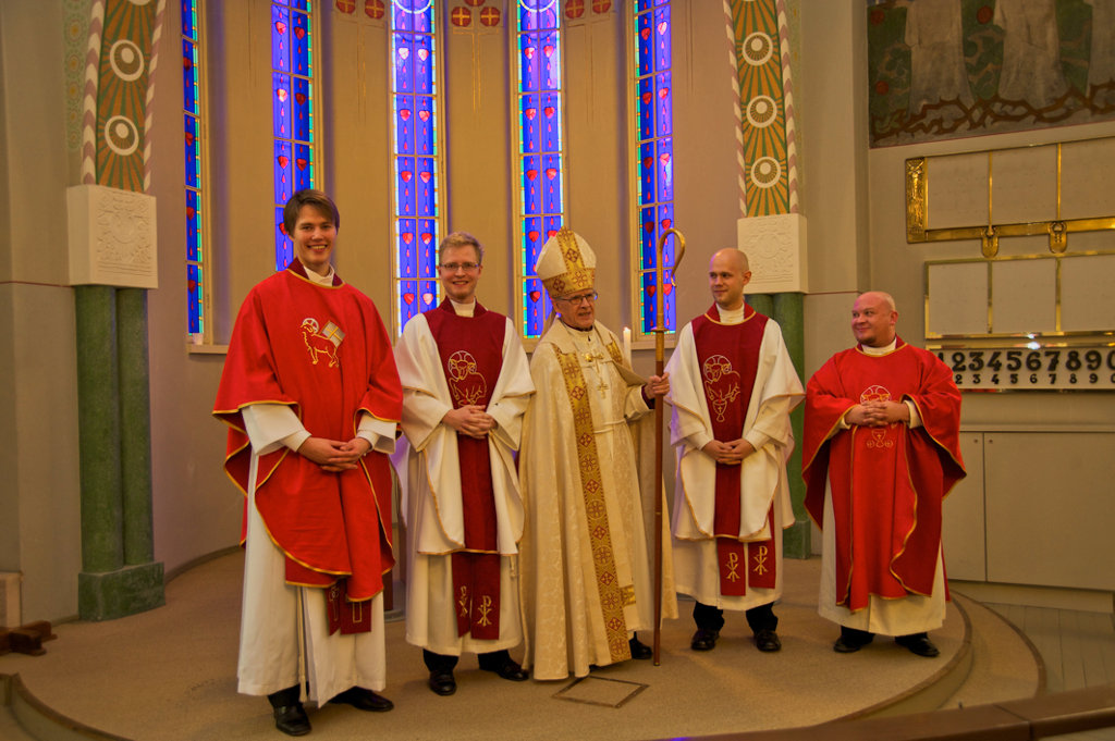 (October 2, 2010) Finnish Confessional Lutheran Bishop Matti Väisänen ordained four young men as pastors Saturday at Sacred Heart Chapel in Helsinki. About 400 people came from all around Finland to participate in the first ordinations held in Finland for the Luther Foundation Finland (LFF). Bishop Väisänen was consecrated in March as an auxiliary bishop in the Mission Province in Sweden and Finland.
