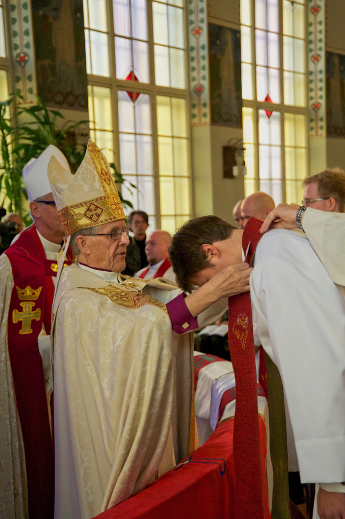 Bishop Matti Väisänen places the stole on Ordinand Eero Pihlava |