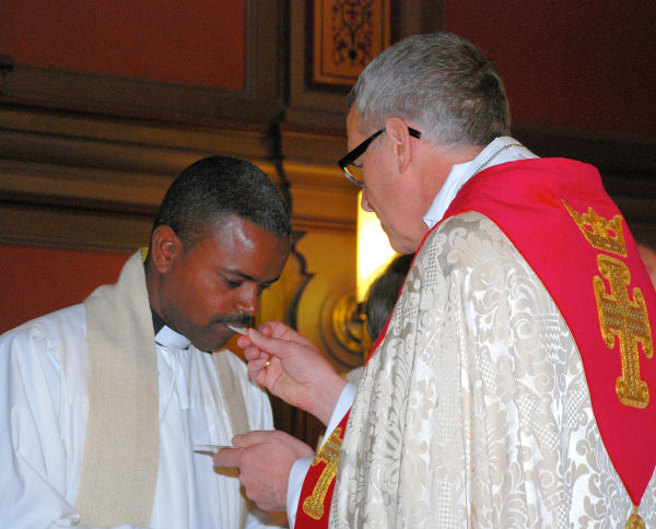 Newly consecrated Bishop Gustafsson led a Communion Service. Here he serves qes Dawit Tufa, President of the Evangelical Lutheran Church in Ethiopia, a church Gustafsson has long assisted as Missions Director of the Swedish Lutheran Mission. |