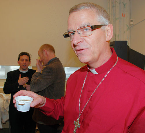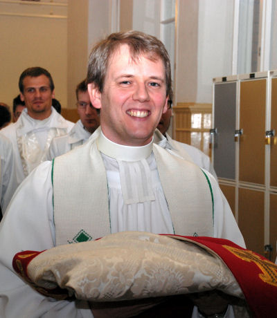 | Pastor Gunnar Andersson bears the bishop’s vestments. |